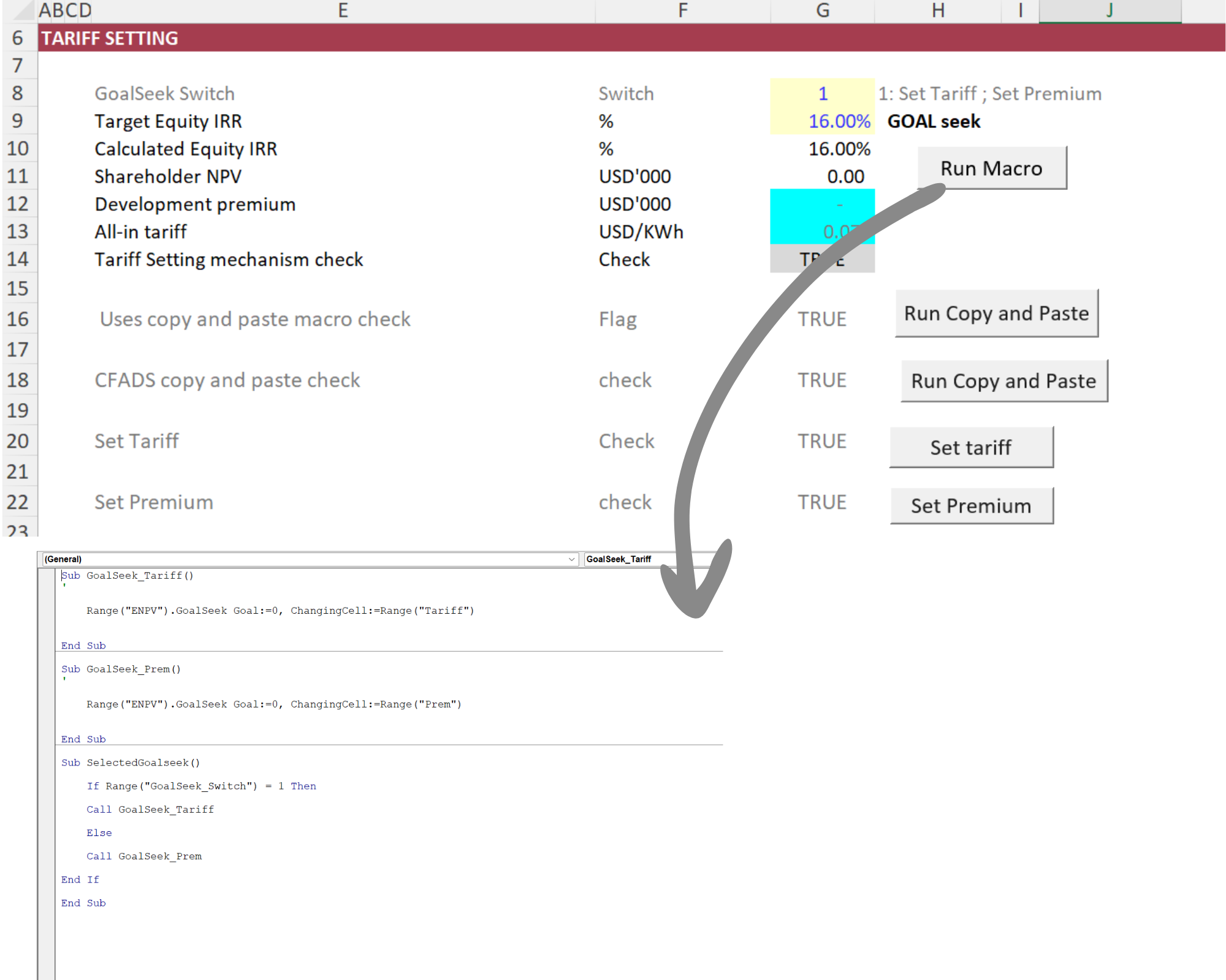 In a tariff setting model, you may want a macro that automates the goal-seeking process for you. Especially if you’re already using copy and paste macros, you’ll want to include goal seek in the automation. A typical example is during PPA negotiations, where you’re setting a tariff based on a target equity IRR. That can easily be automated with a goal seek macro.